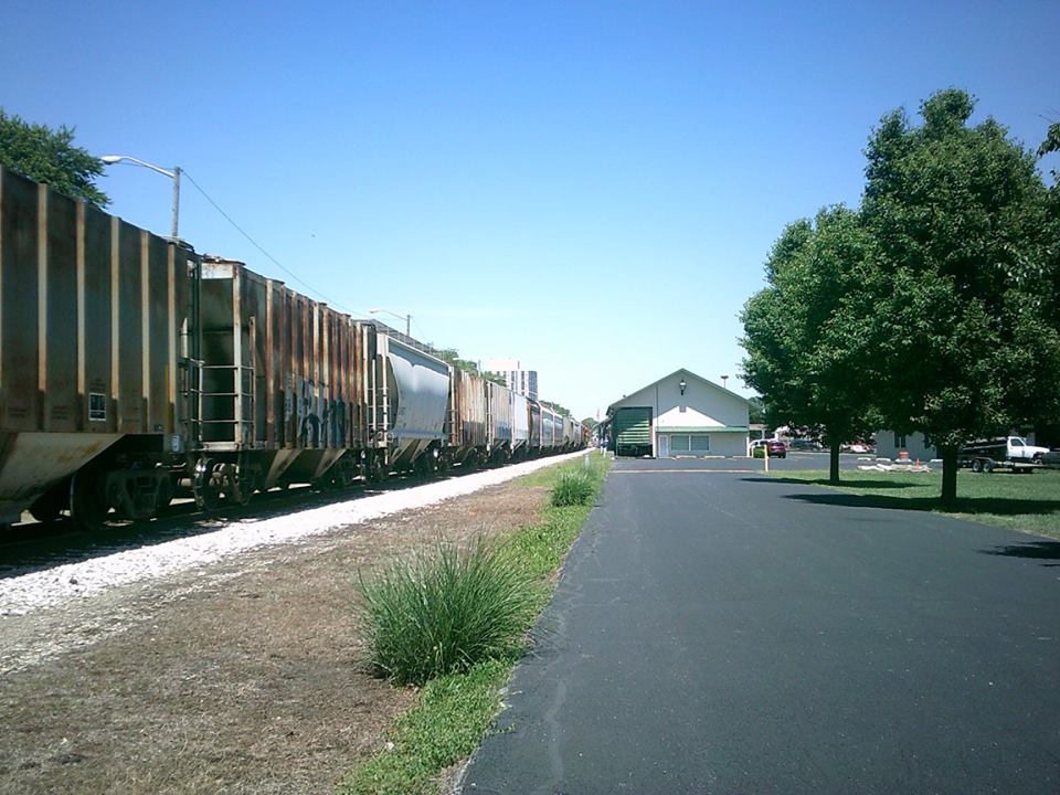 Sitting parked with it's load was a TP&W locomotive # 2056 (GP38-2) and RLK GP38AC #3874 which is a locomotive for IMRR. Ofcourse it was on the IMRR line with IMRR crew. It sat there for a while so we took a few pictures where it was sitting then go up further so I could film it whenever it proceeded onward toward Wesley Road and the TZPR yard area. I'm not sure if it takes it to their yard or the other one by East Peoria. While waiting we listened to the scanner, fiddled around and hung around in the shade to escape the sun. It eventually moves so I film it approach IC Junction and the old C&IM depot at Pekin. It stops for a few minutes so stop filming knowing i'd go up to Wesley Road and film the entire thing there. I knew where itwas heading for so got ahead of it by a few miles and waited til it came. We parked off Wesley Road near ADM where watched the locomotive at that facility do it's thing even though I think it is ugly with a bizarre sounding horn. Productivity is far more important anyway so if it does a well enough job that is all that matters. Personally I think it needs a paint job. I think #8089 was a former IC locomotive. I don't hate it but i rarely pay attention to it. IMRR approaches and I film it there passing by on the mainline.